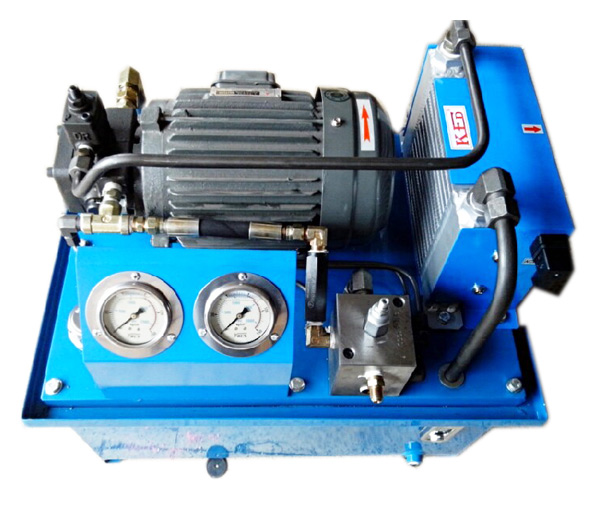 電機帶動油泵旋轉,泵從油箱中吸油供油,將機械能轉換為液壓油的壓力能。液壓油通過集成塊(或閥組合)實行方向、壓力及流量調節后,經外接管路至液壓機械的油缸或油馬達中,從而控制執行機構方向的變換、力量的大小及速度的快慢,推動各種液壓機械作功,實現各種規定的動作。