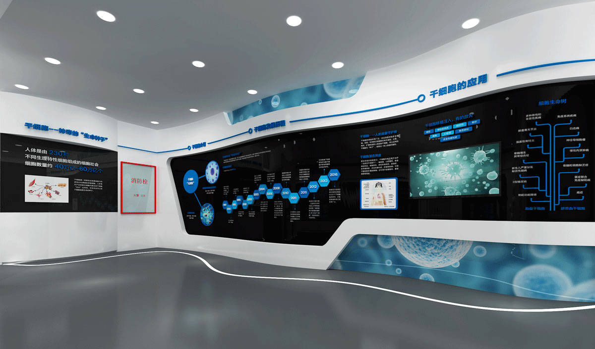 步入展廳的瞬間,腳下的感應玻璃即刻幻化成流動的血管網絡。30 米長的 "時空隧道" 用動態數據圖譜展示著我國干細胞研究從實驗室到臨床的跨越:懸浮的年份標簽被觸碰時,會投射出對應年份的重大突破在環繞式幕墻上娓娓道來。