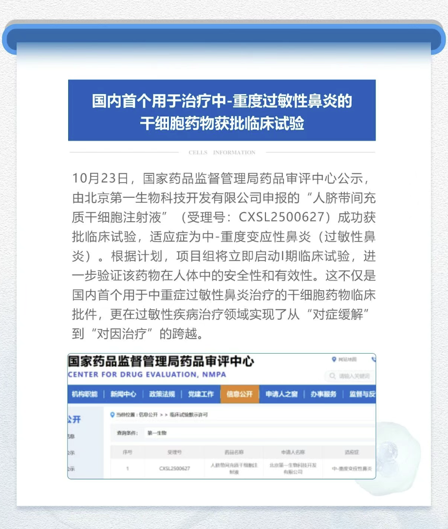 1. 國(guó)內(nèi)首個(gè)用于治療中-重度過(guò)敏性鼻炎的干細(xì)胞藥物獲批臨床試驗(yàn)