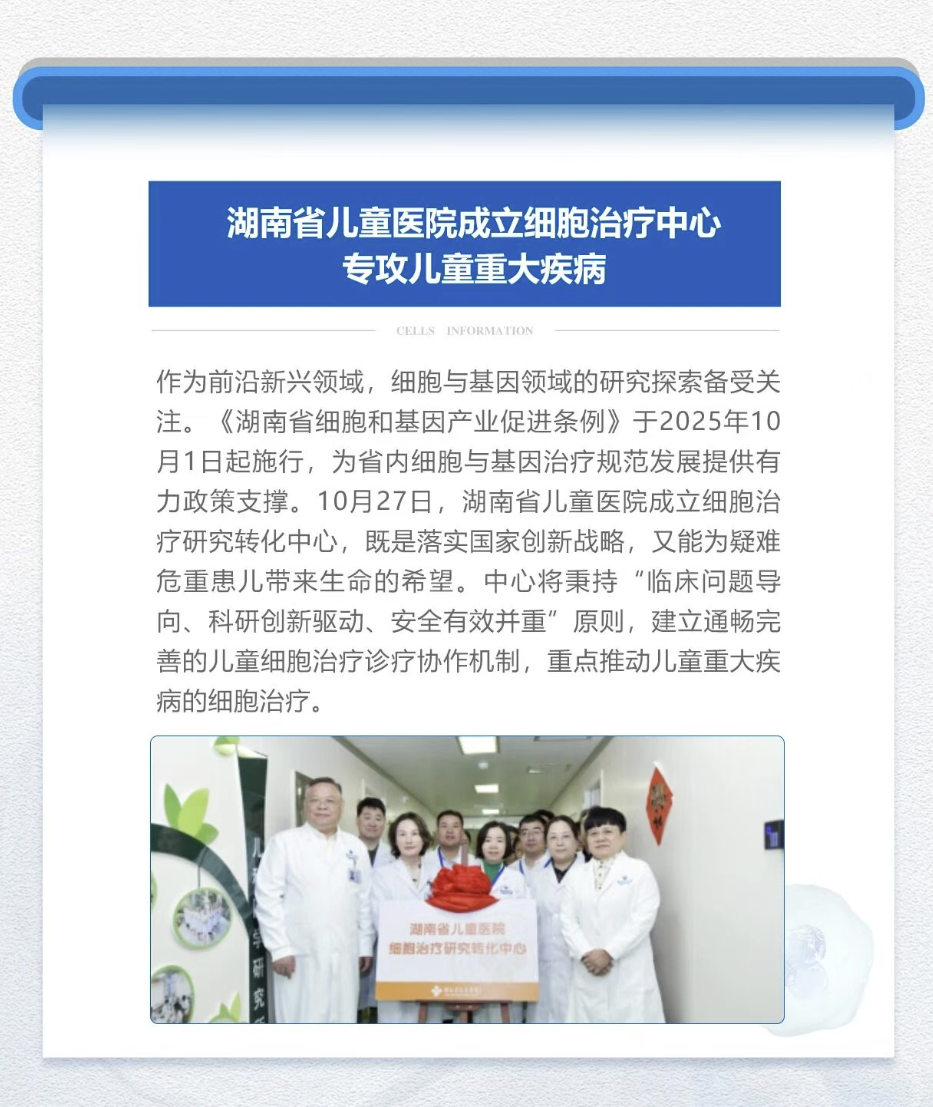 4. 湖南省兒童醫(yī)院成立細(xì)胞治療中心,專攻兒童重大疾病