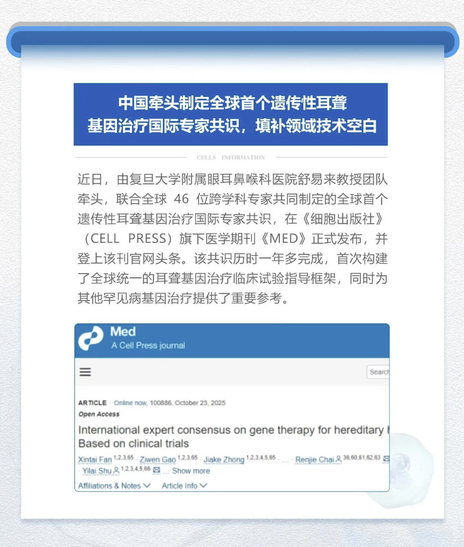 5. 中國(guó)牽頭制定全球首個(gè)遺傳性耳聾基因治療國(guó)際專家共識(shí),填補(bǔ)領(lǐng)域技術(shù)空白