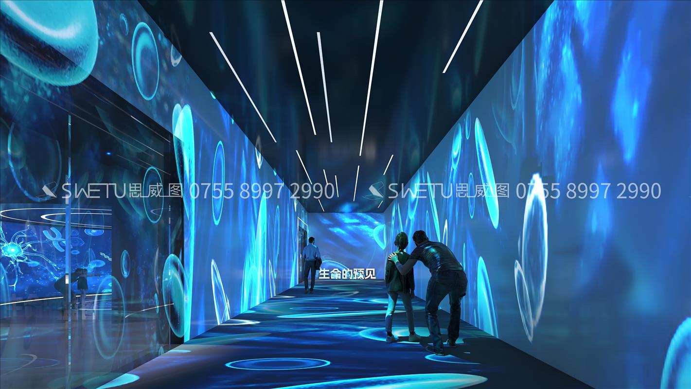 采用全息投影技術(shù)打造直徑8米的"細(xì)胞宇宙"穹頂,觀眾仰頭即可看到受精卵分裂為干細(xì)胞的動(dòng)態(tài)過(guò)程。地面互動(dòng)投影隨腳步泛起DNA雙螺旋波紋,兩側(cè)展墻以顯微攝影藝術(shù)呈現(xiàn)皮膚、血液、神經(jīng)等不同細(xì)胞的分化圖譜。